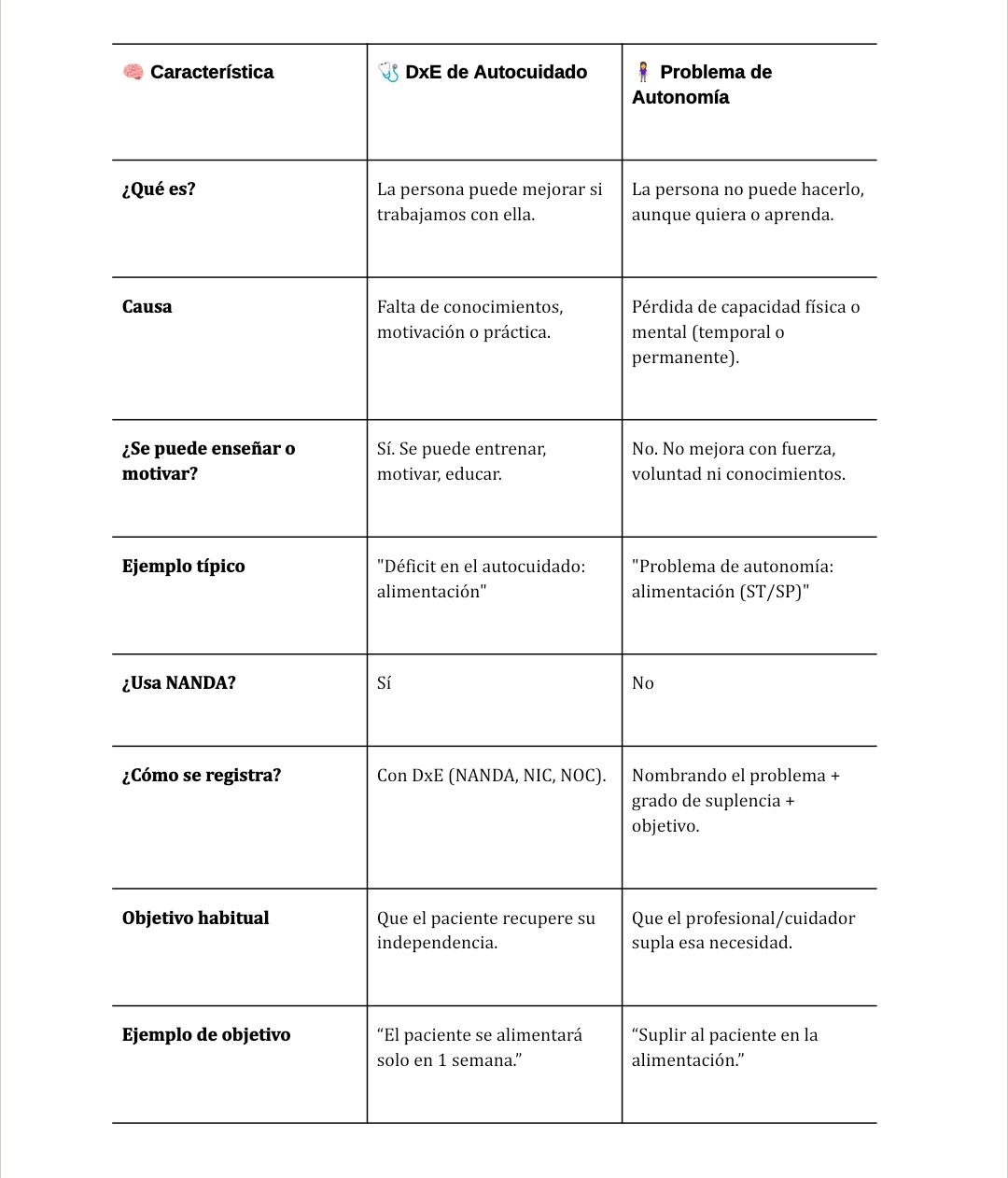 Aquí tienes una tablita resumen con todo lo importante para diferenciar entre un DxE de autocuidado y un problema de autonomía, explicada de forma fácil 😄: